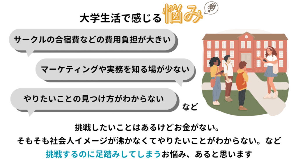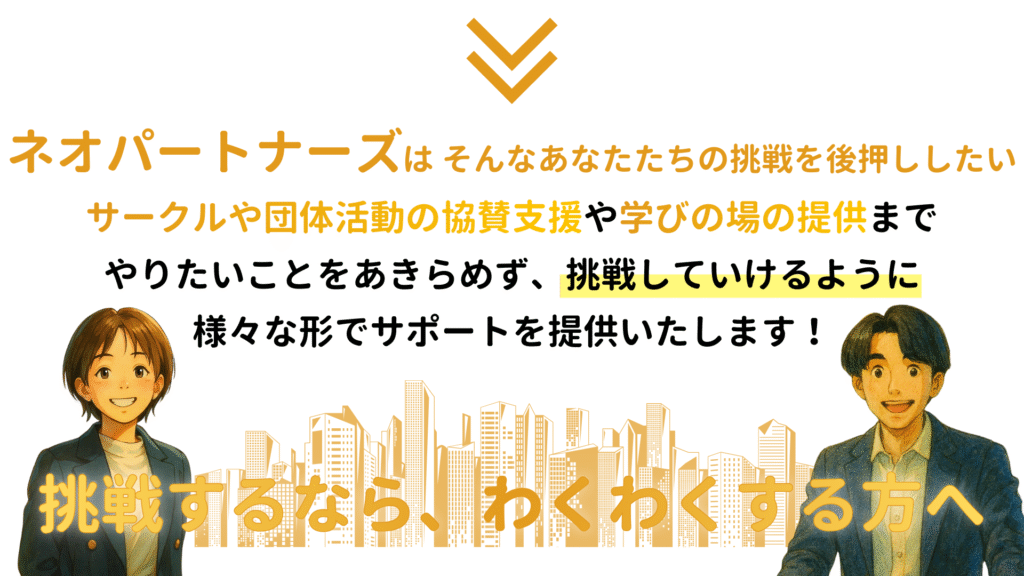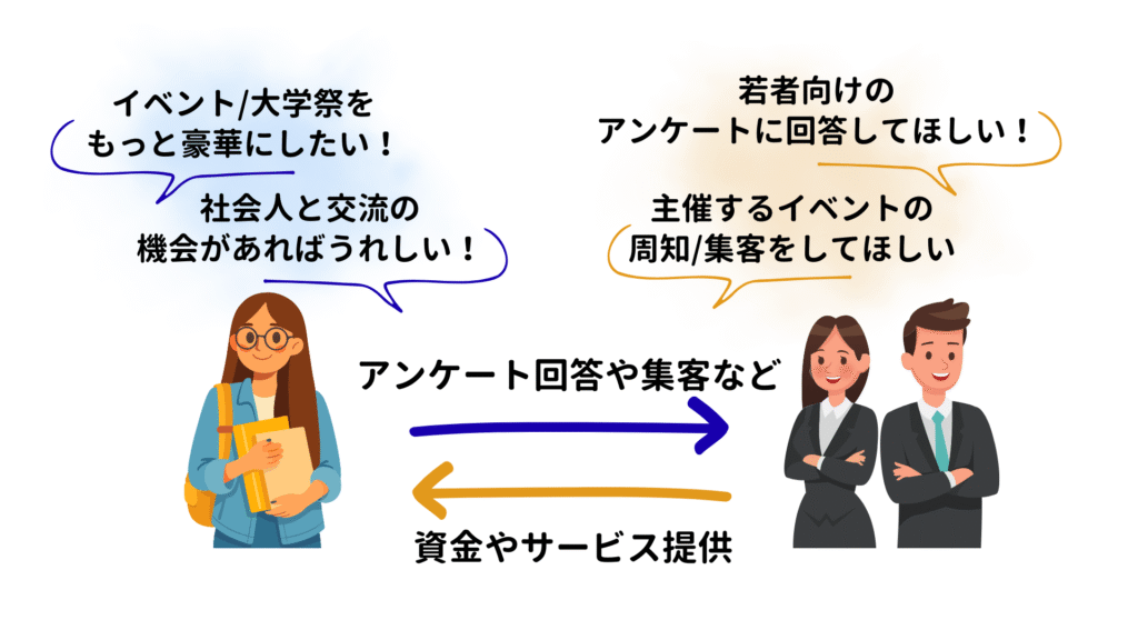 例えば、”イベント・大学祭をもっと豪華にしたい””部費をもう少し抑えて、他の活動にもお金をかけたい””社会人と交流ができる機会があったらいいな”など、大学生の皆さんがさまざまやりたいことがある中で、それをサポートすることが協賛(スポンサー)といいます。